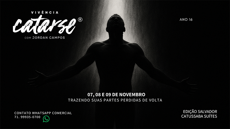 O CATARSE é uma vivência em Terapia Profunda, onde uma média de 60 participantes vindos do Brasil e mundo ficam imersos em um Hotel (Catussaba) - Stela Maris - Salvador - BA; executando um protocolo avançado de autoconhecimento terapêutico desenvolvido pelo psicoterapeuta Jordan Campos e em uso pleno há mais de 16 anos. Uma experiência profunda e de tamanha riqueza, que os participantes costumam dizer que foi ali o grande divisor de águas da lucidez, em suas vidas.